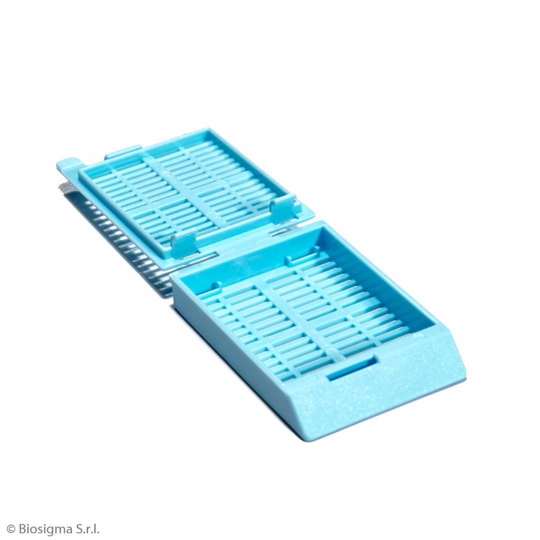 Kazety na biopsiu, odnímateľné veko, rozmery: 40 x 28 x 7 mm, štvorcové otvory na veku (1 x 1 mm), farba: svetlomodrá
