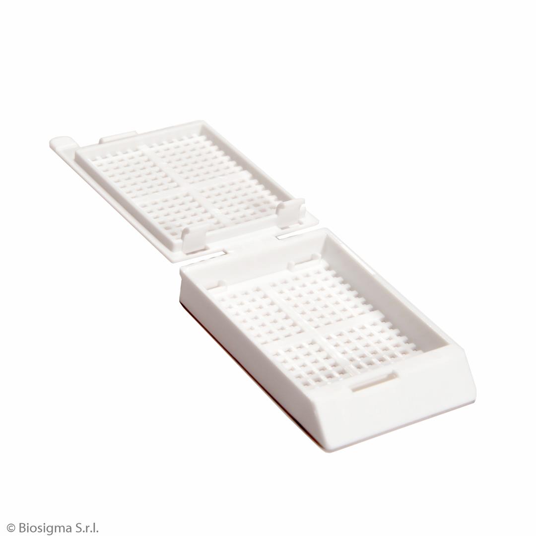 Kazety na biopsiu, odnímateľné veko, rozmery: 40 x 28 x 7 mm, štvorcové otvory na veku (1 x 1 mm), farba: biela